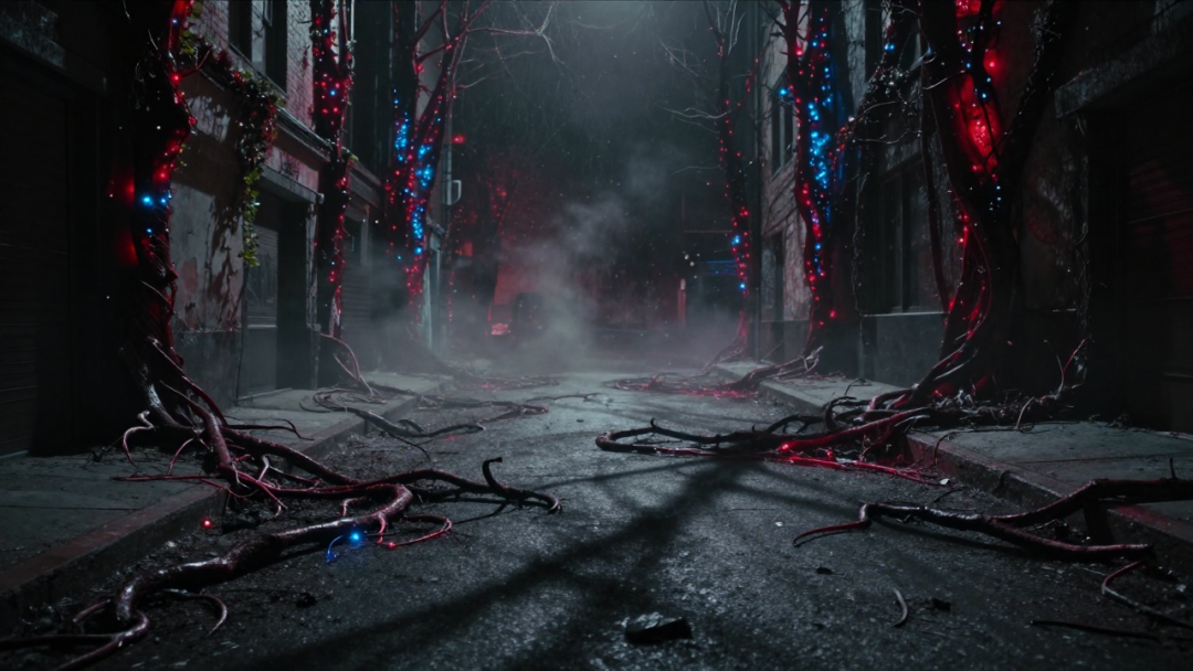 你别说,从图片效果看,树干和藤蔓被红蓝生物光点覆盖,街道里雾气弥漫,整体效果已经有了很强的电影级真实感,感觉下一秒“魔狗”就跑来抓人了。