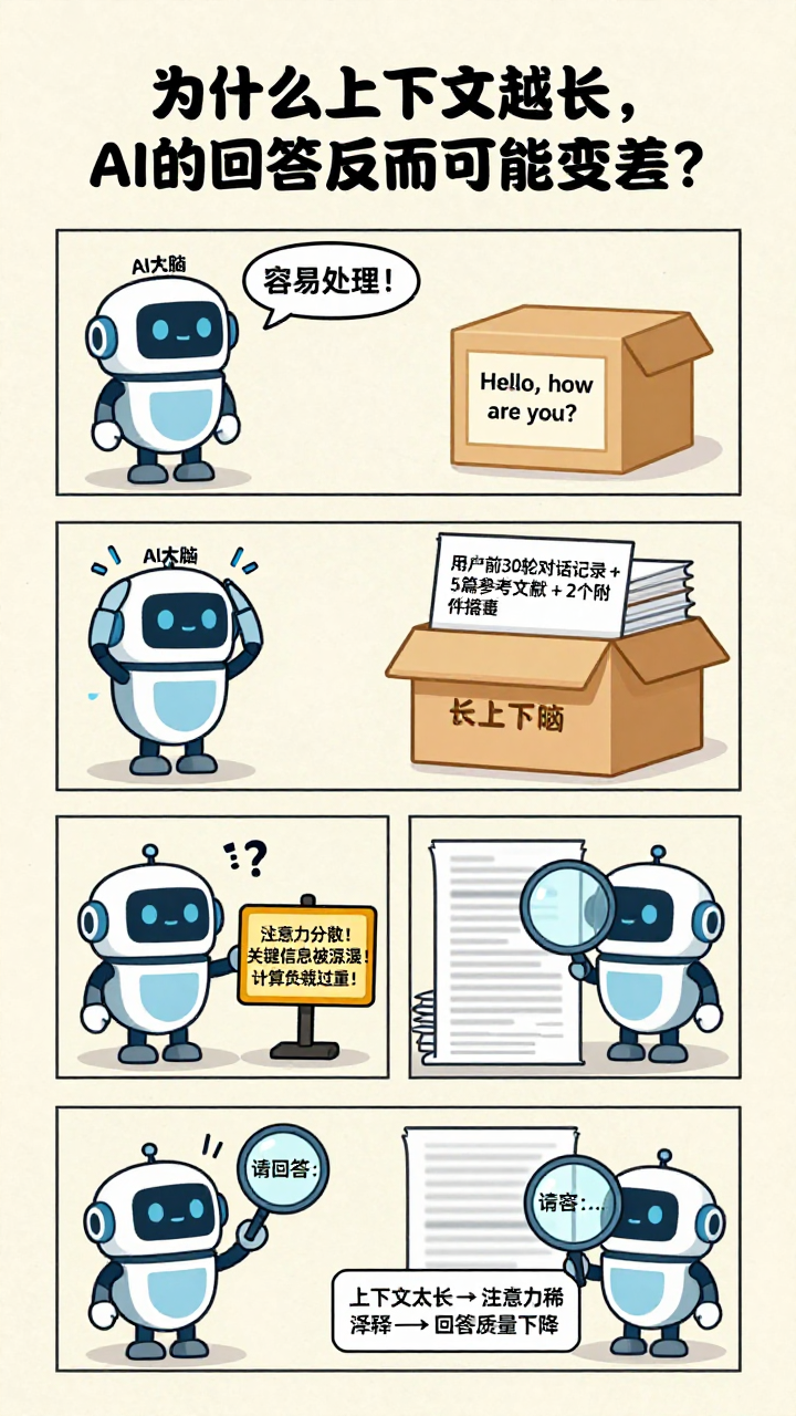 这次我想考考它的“常识推理”,让它用科普漫画解释“为什么上下文越长,AI的回答反而可能变差”,看看这模型肚子里的知识储备咋样:
