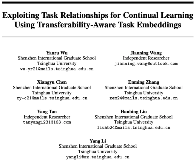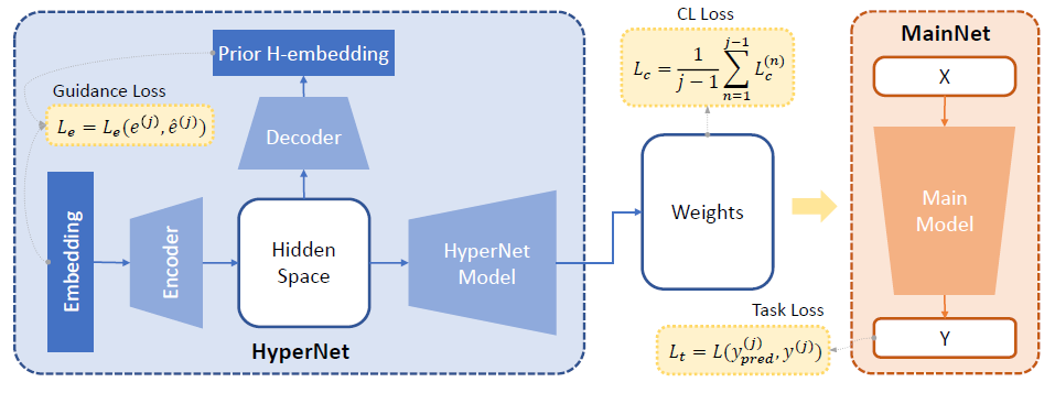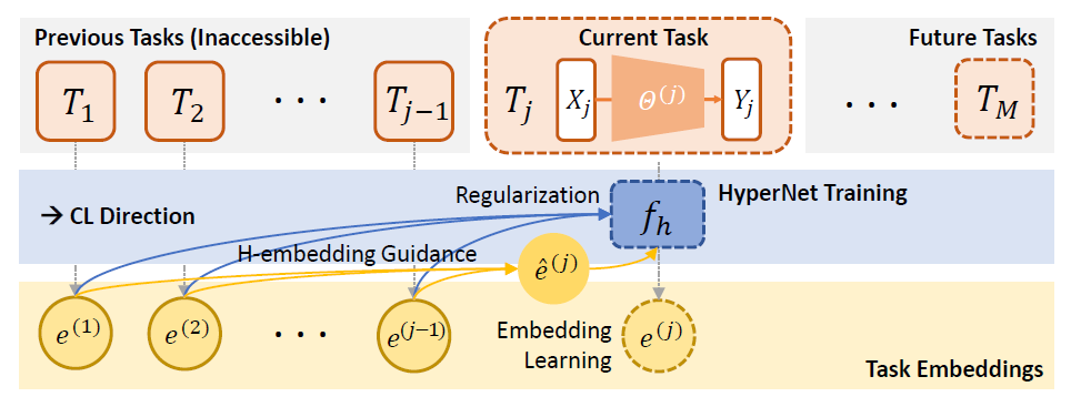 其核心思想是:在每次学习新任务前,通过信息论度量构建可迁移性感知的任务嵌入H-embedding,并利用超网络根据嵌生成任务专属参数,从而显式地在CL过程中编码任务关系。