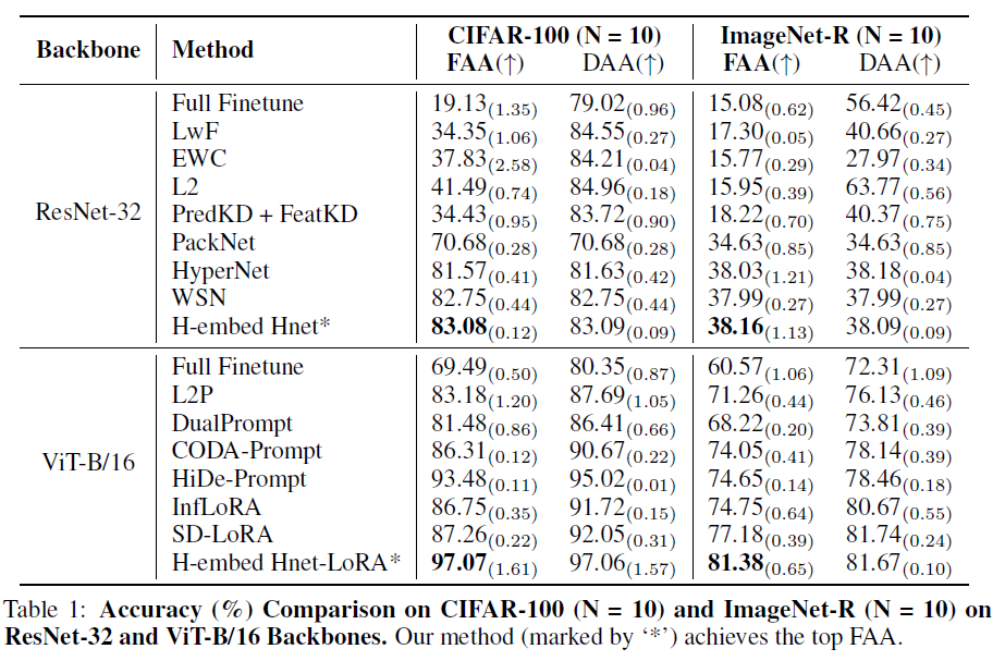 H-embedding引导的超网络框架在多个基准上取得领先表现,展示了任务关系建模在持续学习中的关键作用。