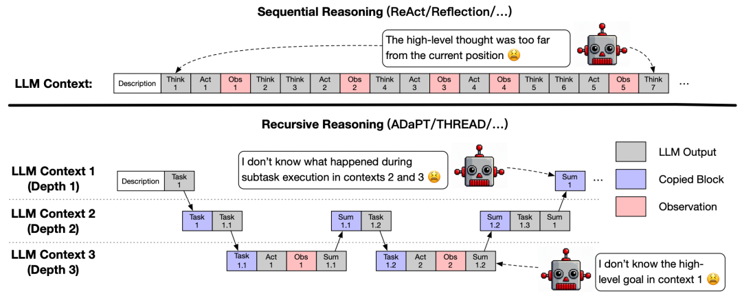 层级推理(例如ADaPT,THREAD)将任务分解为子任务来明确目标,但给子任务单独分配上下文示例和提示词,导致上下文断层和成本爆炸。