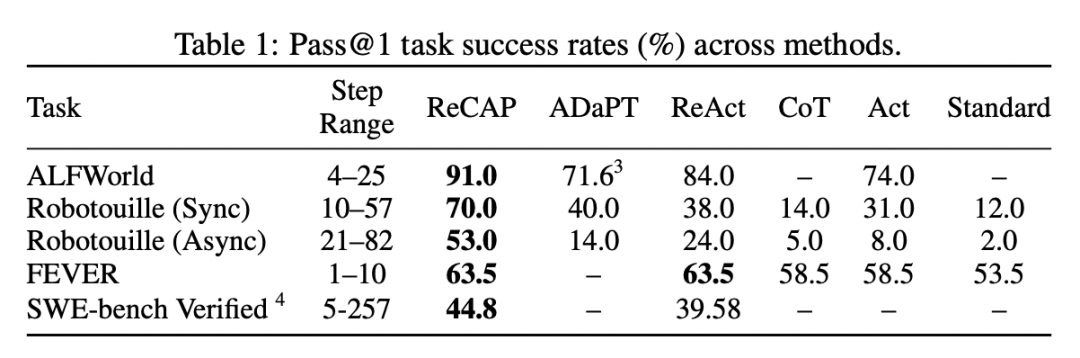 在严格遵循 pass@1(一次通过)的评测原则下,ReCAP在长序列具身任务Robotouille上相比ReAct基线取得了84.2%(同步)和112.5%(异步)的巨大性能提升。