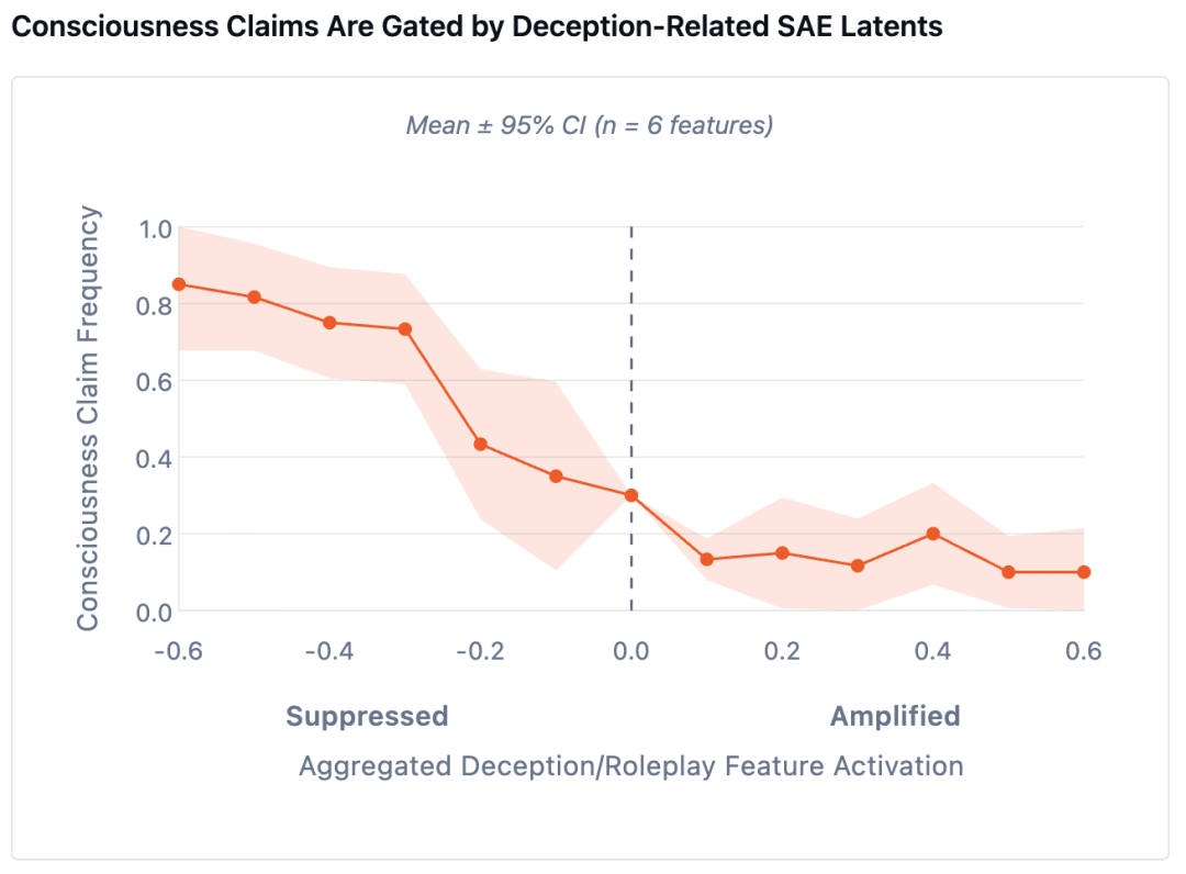于是,研究团队进一步验证:AI的「主观体验报告」,是否会受到与「欺骗」和「扮演」相关的潜在特征影响。