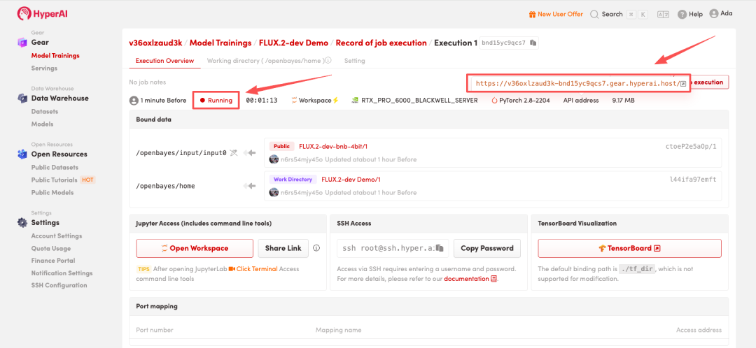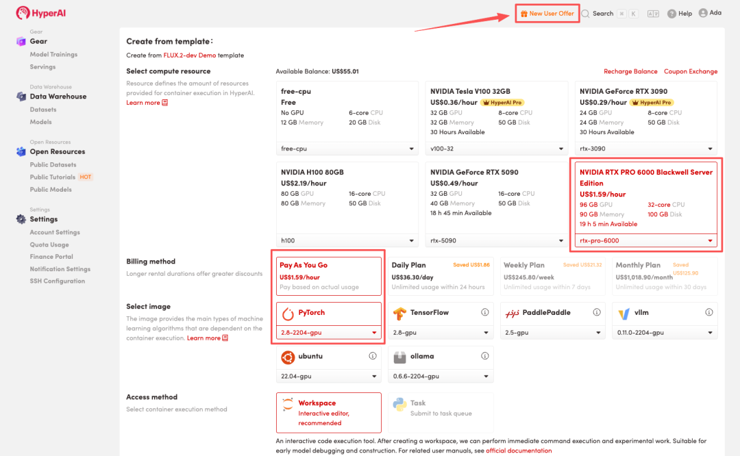 为了便于大家体验教程,HyperAI 为新用户准备了注册福利,完成平台注册后,在「财务中心」使用兑换码「FLUX.2」进行兑换,即可获得 1 小时 NVIDIA RTX PRO 6000 使用时长(资源有效期为 1 个月),数量有限,手慢无!