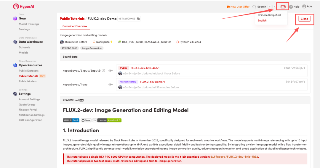 2.页面跳转后,点击右上角「Clone」,将该教程克隆至自己的容器中。