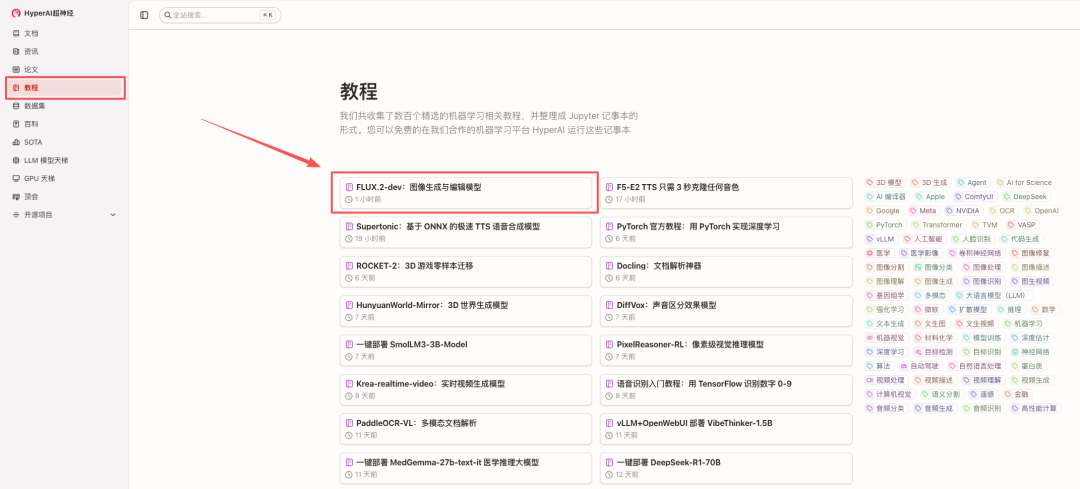 1.进入 hyper.ai 首页后,选择「FLUX.2-dev:图像生成与编辑模型」,或进入「教程」页面选择。进入点击「在线运行此教程」。