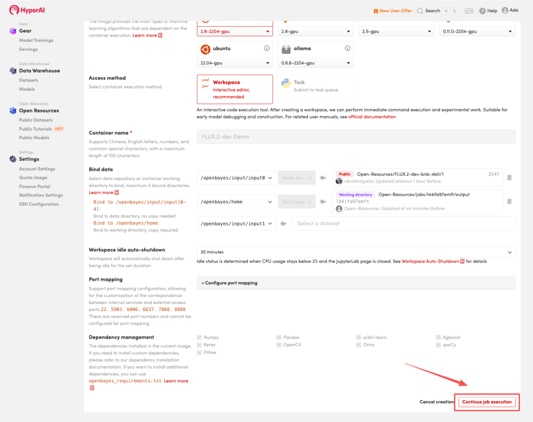 3.选择「NVIDIA RTX PRO 6000 Blackwell Server Edition」以及「PyTorch」镜像,按照需求选择「Pay As You Go(按量付费)」或「Daily Plan/Weekly Plan/Monthly Plan(包日/周/月」,点击「Continue job execution(继续执行)」。