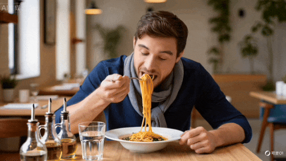 这回我也让可灵O1上桌来一口——大口吃面+直视镜头,结果人物面部和周围场景都稳得住,小帅吃的那叫一个香啊: