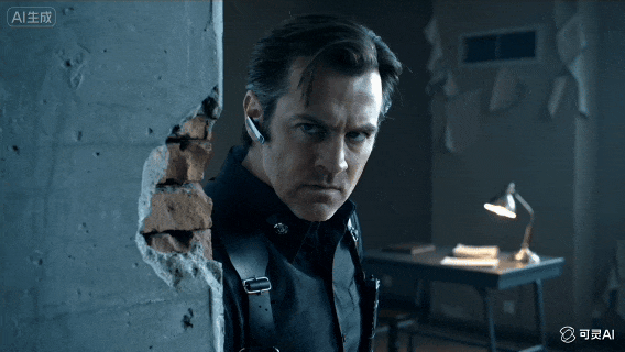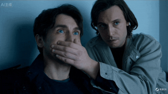 基于该视频生成下一个镜头:突然,一只手落在男人的肩上,视频里的男人一回头,发现是自己的特工搭档,搭档立刻捂住他的嘴让他别出声,两人神情紧绷地扫视四周。