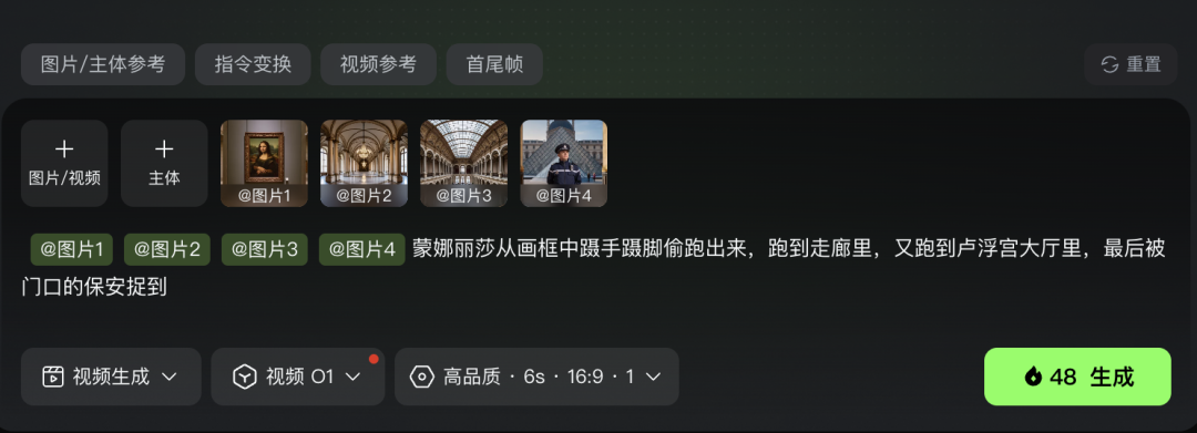 我把包括蒙娜丽莎、卢浮宫走廊、卢浮宫大厅、门口保安四个主题元素喂给了O1模型,并给予了AI一段剧情提示词: