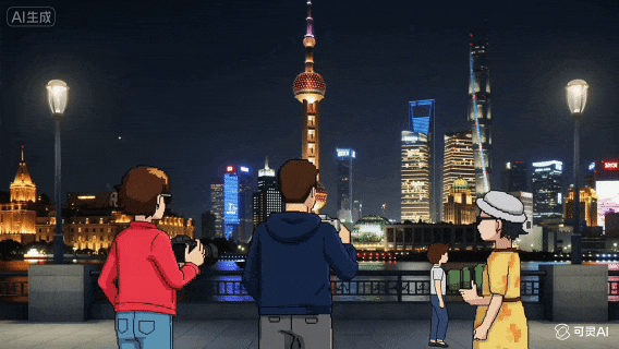 看够了真实世界,咱再换个画风,这次我丢给O1的是一段像素风的外滩夜景视频,游客们在那儿咔擦咔擦给东方明珠拍照: