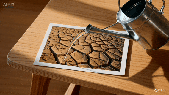一把复古金属浇水壶从画面右上角伸入,壶口倾斜,将水壶里的水流浇湿到明信片的土地上,照片里干裂的土地迅速变湿,颜色加深,湿润的土地从裂缝中冒出嫩绿春笋破土而出,迅速生长拔高,从明信片中长出来,3D效果。