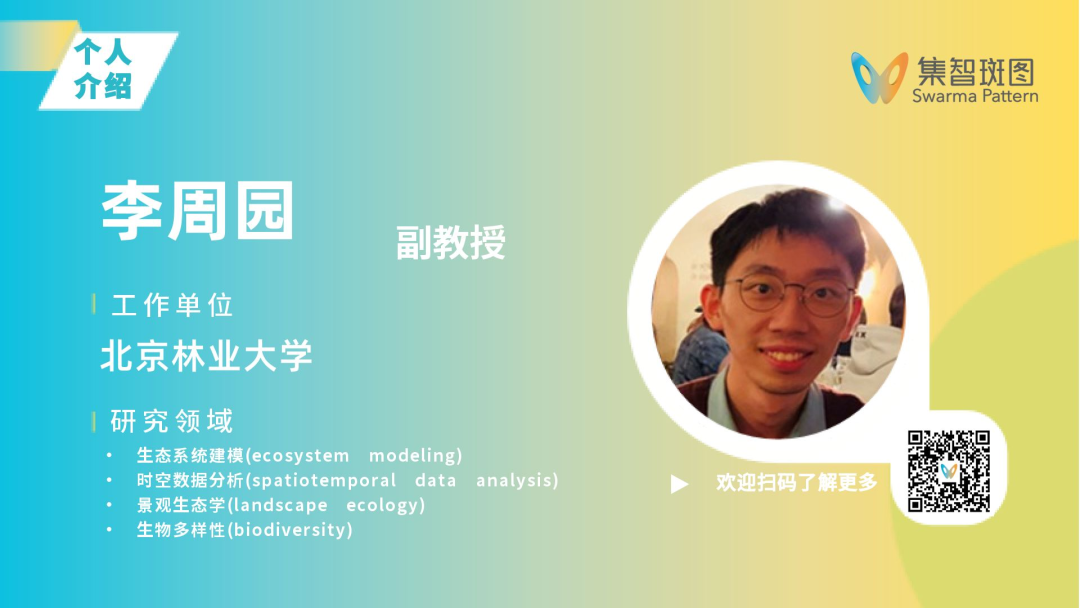 李周园,北京林业大学副教授,清华大学博士、北京大学理论生态学组博士后,Wageningen大学访问学者,国际生态模型学会顾问委员。开设生态系统分析与建模国际研究生课程,《生态系统管理》教材主编、Elsevier《生态学百科全书》英文版编委。研究论文发表于ES&T、Functional Ecology、Ecology Letters等一流国际刊物,主持国家自然基金、国家重点研发计划项目专题、国家重点实验室开放基金、国家外专局国际合作等科研项目。从事理论生态学方法在草地生态学、景观生态学应用交叉研究。研究方向:生态系统建模 (ecosystem modeling)、时空数据分析(spatiotemporal data analysis)、生物多样性(biodiversity)。