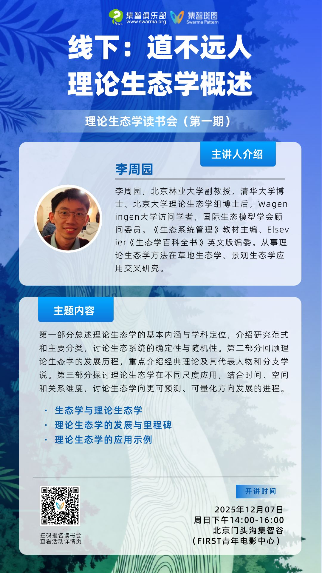 2025年12月7日(周日)下午14:00-16:00,集智谷线下+腾讯会议线上同步进行,感兴趣的朋友扫码报名加入理论生态学读书会后,可进入学员群进行交流。有意线下到场参加的学员可在报名读书会后,请扫描线下报名渠道二维码,提交报名信息。