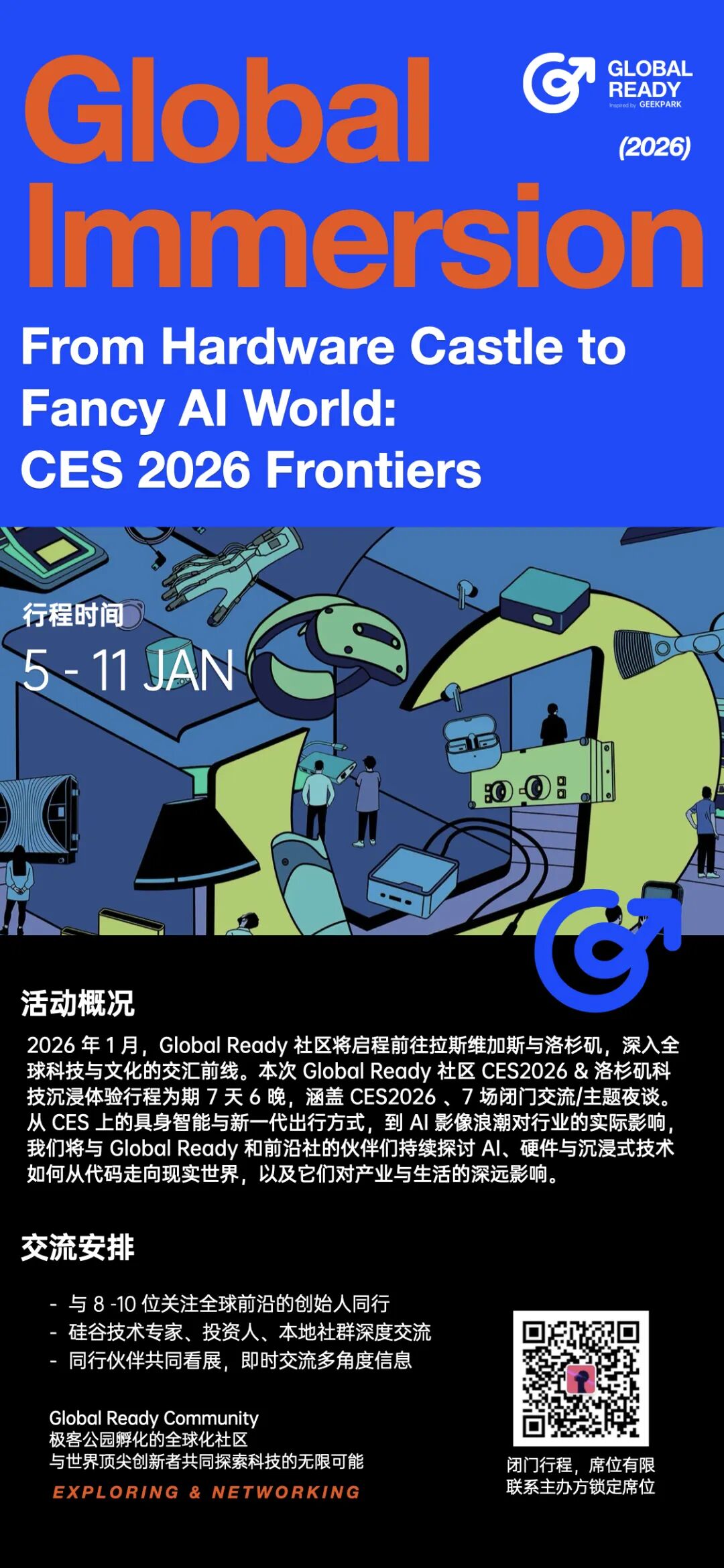 2026 年 1 月初,极客公园的 Global Ready 社区组织了一场闭门活动,行程包括 CES 2026 看展、7 场闭门交流/主题夜谈等。