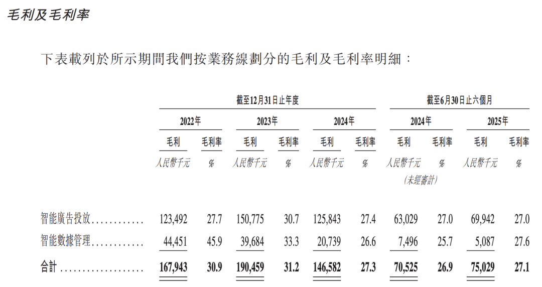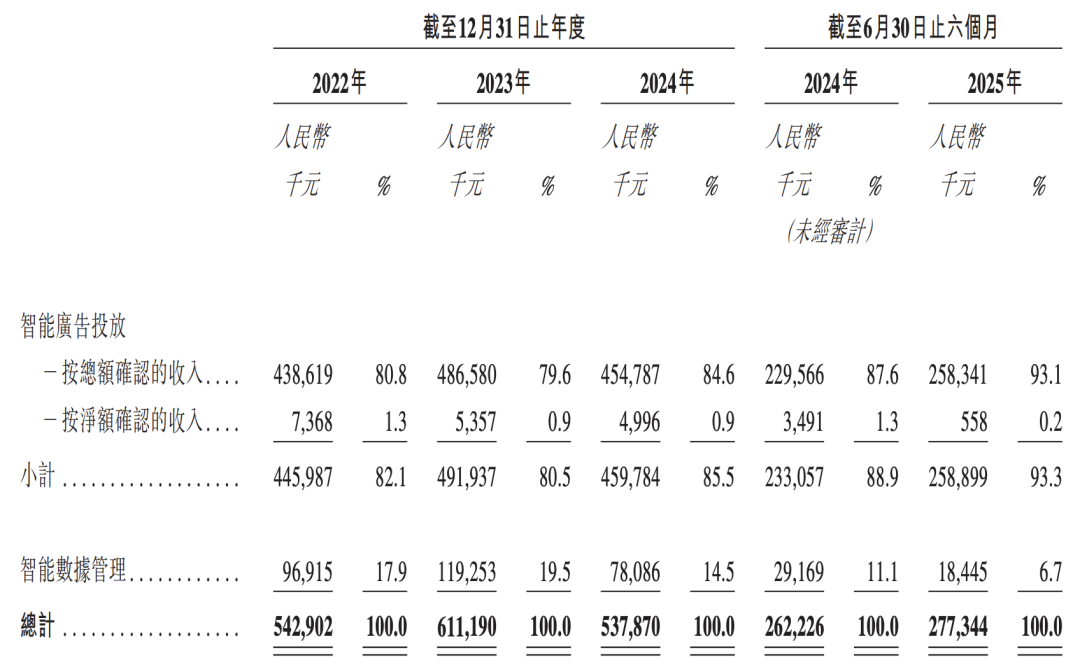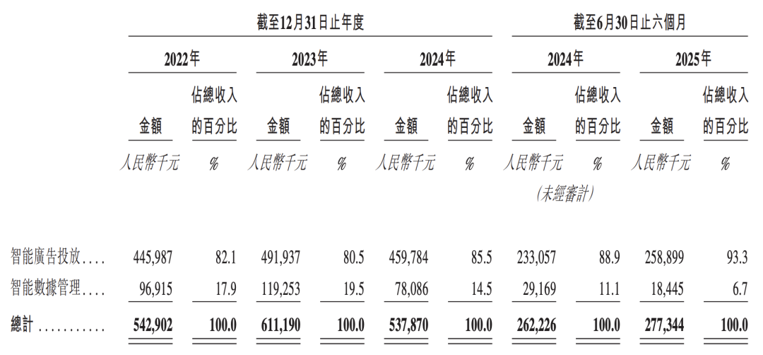 该业务在2022年、2023年及2024年的收入占比分别为82.1%、80.5%及85.5%。至2025年上半年,智能广告投放业务贡献收入人民币2.59亿元,占总收入比例进一步提升至93.3%。