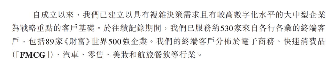 在往绩记录期间,公司累计服务约530家终端客户,包含89家《财富》世界500强企业,客户行业分布于电子商务、快速消费品、汽车、零售及美妆等领域。
