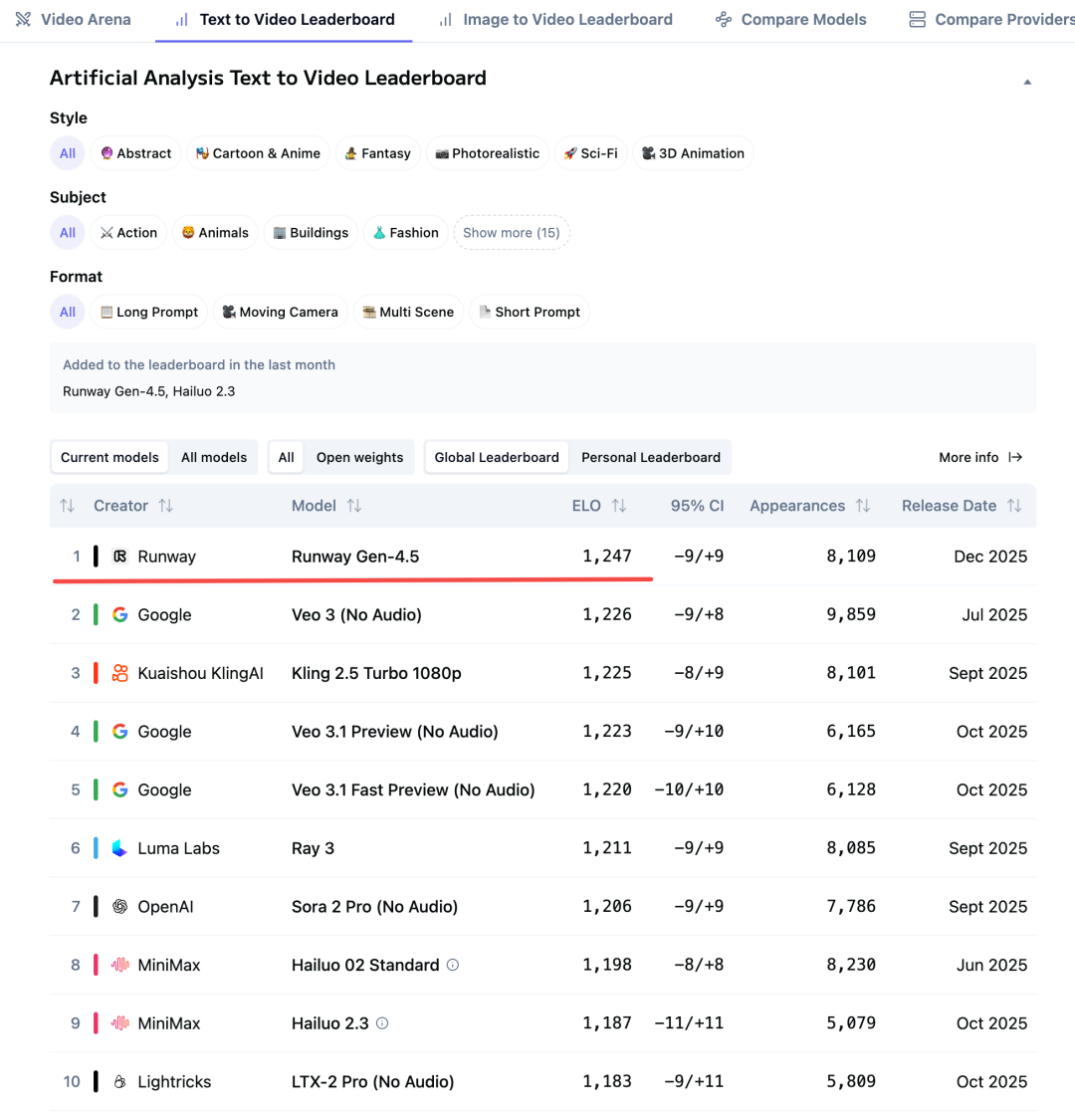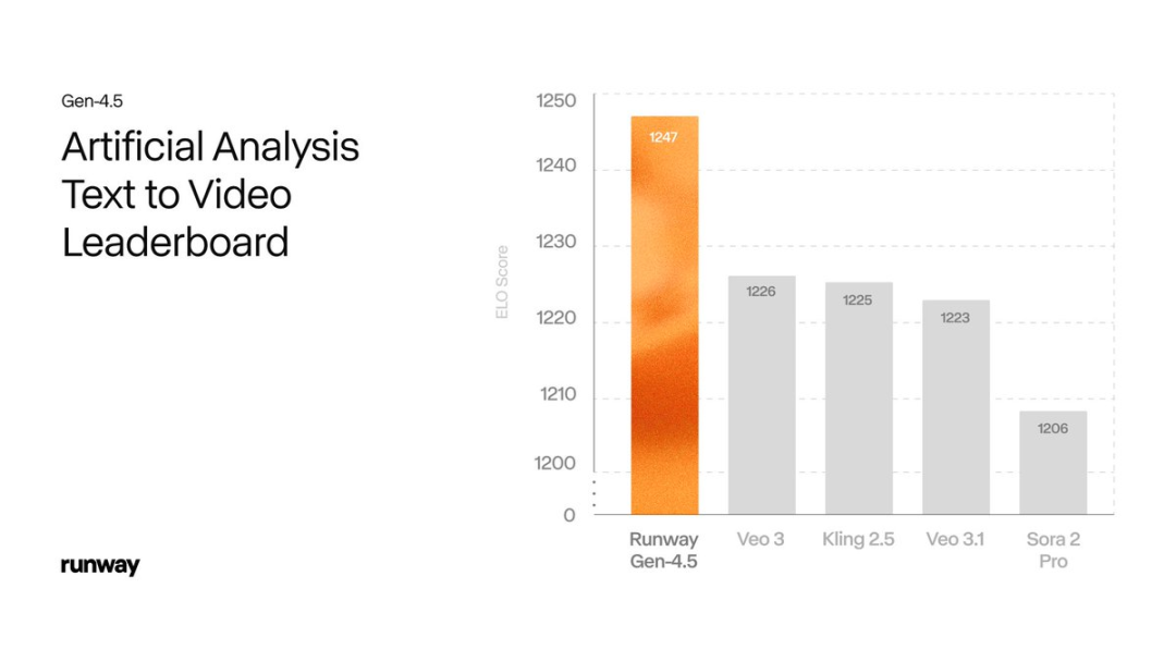 Gen-4.5在ArtificialAnalysis文本转视频排行榜中获得1,247Elo积分,创下新标准并超越了全球所有其他AI视频模型。