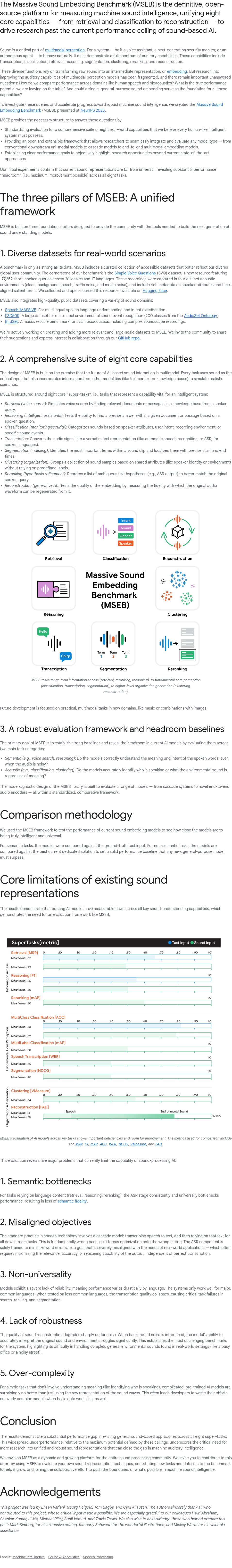 MSEB是一个开源平台,旨在统一衡量机器声音智能的八大核心能力,包括检索、分类、重建等,推动声学AI研究突破现有性能瓶颈。声音是多模态感知的关键部分,语音助手、安防监控和自主智能体等系统需具备全面的听觉功能,如转录、推理、聚类和重排序。这些功能依赖于将原始音频转化为嵌入表示。然而,当前多模态模型在听觉能力提升方面的研究较为分散,缺乏跨领域(如人声与生物声)性能比较的统一标准。MSEB通过整合多样化任务与数据集,提供全面评估框架,促进音频嵌入技术的发展,填补了该领域的评测空白,助力构建更强大、通用的声音理解系统。