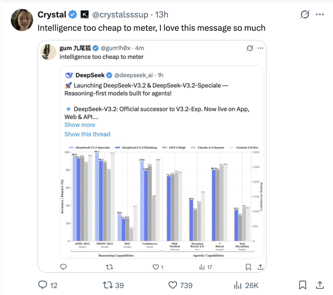 这不仅击碎了开源模型落后闭源模型半年的质疑,又顺便给硅谷的闭源AI公司好好上了一波压力。
