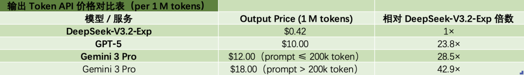 如果从百万token输出成本来看,DeepSeek-V3.2比GPT-5便宜近24倍,比Gemini 3 Pro,便宜近29倍。