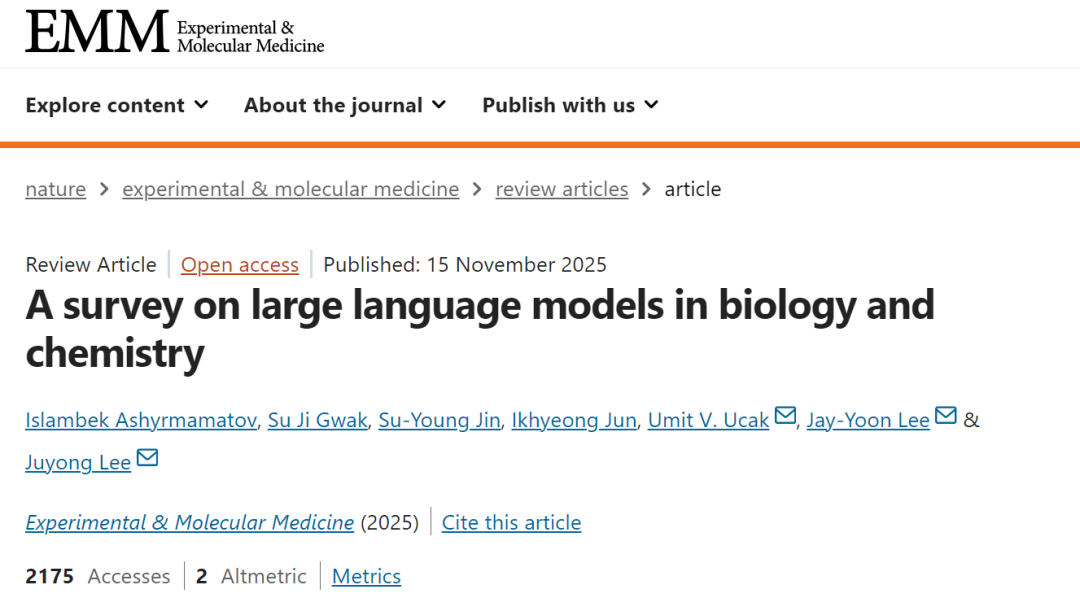 2025年11月15日,首尔大学研究团队在《Experimental & Molecular Medicine》期刊上发表一篇题为“A survey on large language models in biology and chemistry”的综述文章。