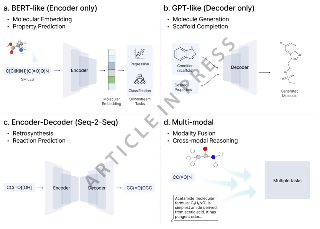 化学语言模型(CLMs)根据架构设计的不同,这些模型可分为多种类别,主要包括仅编码器(BERT类)模型、仅解码器(GPT类)模型、编码器–解码器模型以及多模态LLM(图3)。