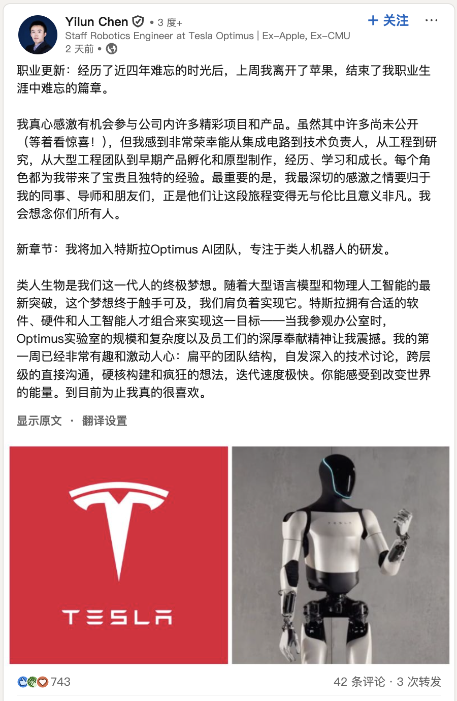 就在JG官宣退休的同一时间,苹果机器人与具身智能技术负责人Yilun Chen在LinkedIn上更新了动态,他的下一站是特斯拉。