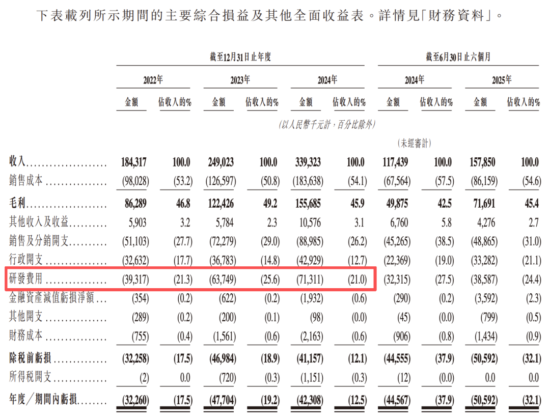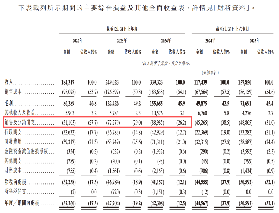 2022—2024年,其销售及分销开支分别为人民币5110万元、7230万元与8900万元,占当年收入的27.7%、29.0%与26.2%。