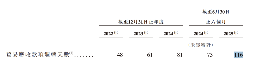 公司回款周期明显拉长,从不到两个月延至近四个月——2022年至2024年及2025年上半年,同期贸易应收账款周转天数分别为48天、61天、81天及116天。