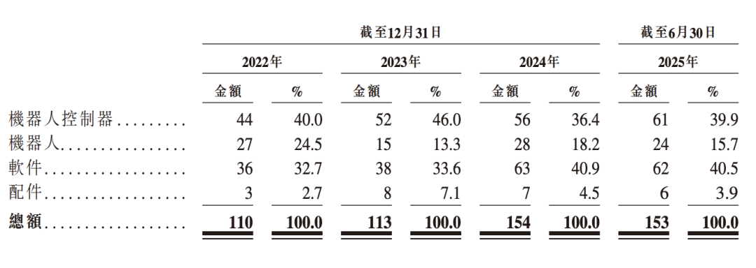 相比机器人和控制器,仙工智能软件与配件的收入规模较小。
