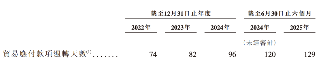 贸易应付账款周转天数在同期间分别为74天、82天、96天及129天。