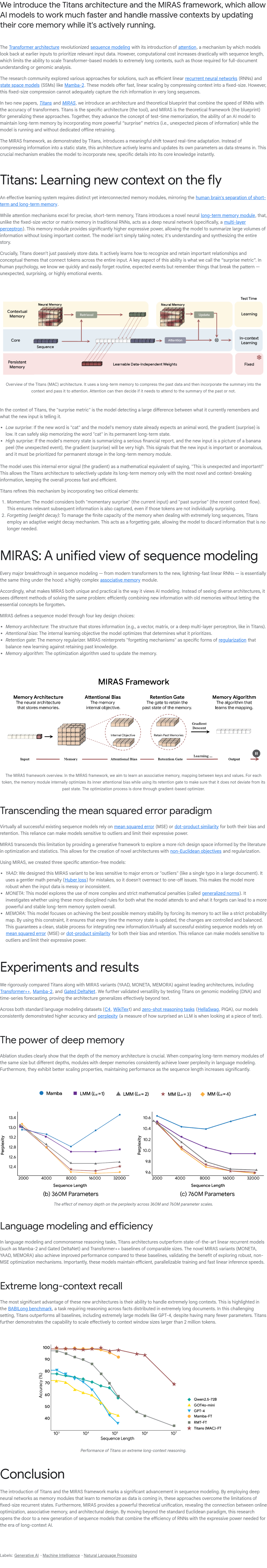 Titans架构与MIRAS框架通过在模型运行时动态更新核心内存,显著提升AI模型处理超长上下文的效率。传统Transformer依赖注意力机制,但计算成本随序列增长急剧上升,难以扩展至极长上下文。现有方案如线性RNN和Mamba-2等状态空间模型虽实现线性扩展,但因采用固定大小压缩上下文,无法充分保留长序列中的丰富信息。两项新研究提出Titan架构,结合动态内存更新机制,在保持高效运算的同时支持超大规模上下文处理,突破当前模型在文档级理解与基因组分析等任务中的局限,为下一代长上下文AI系统提供新路径。