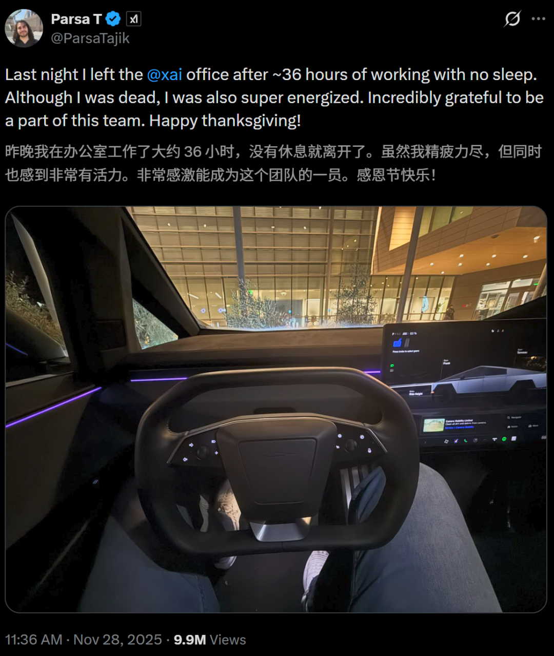 感恩节后深夜,xAI工程师Parsa Tajik走出办公室。