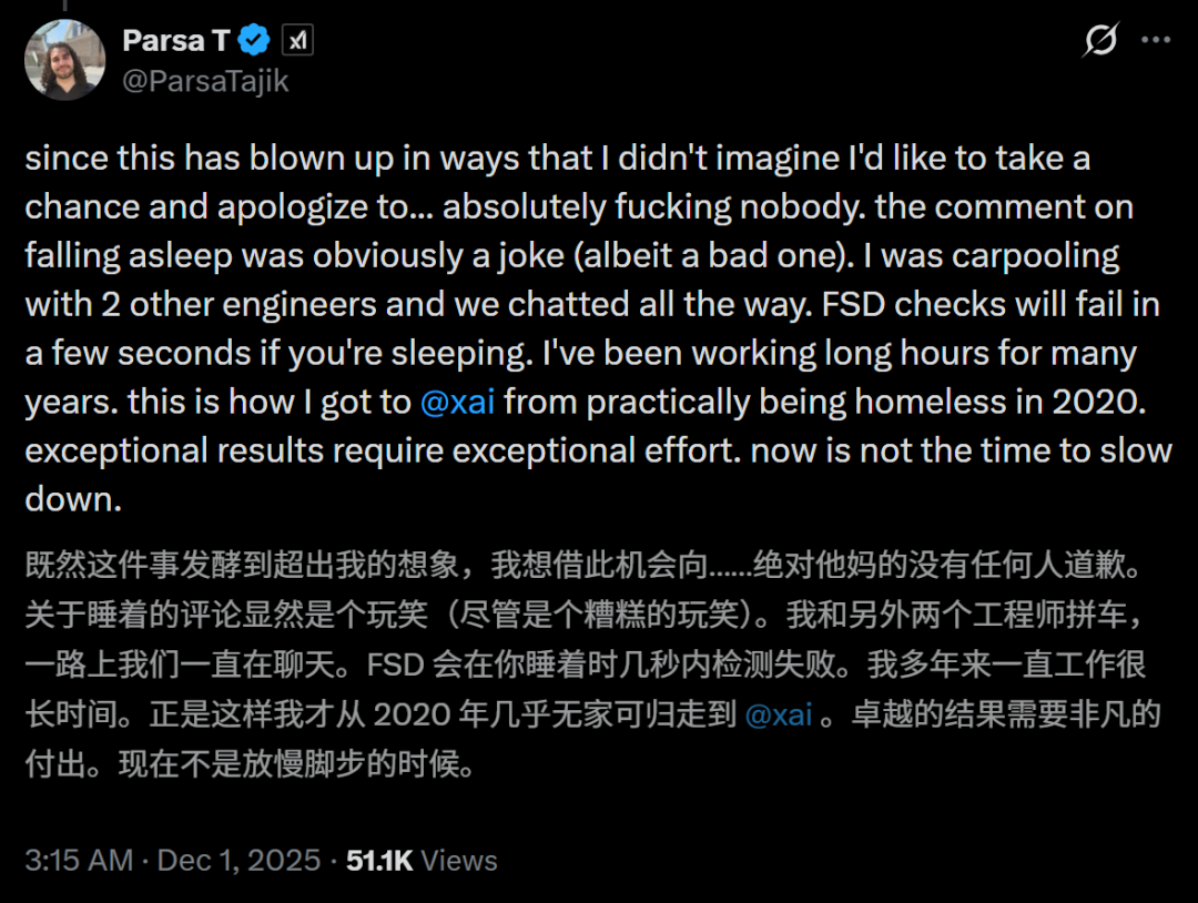 三天后,Tajik回复称他不需要向「任何人」道歉,并表示他与另外两名工程师拼车,乘坐开启了FSD功能的特斯拉,安全回家。