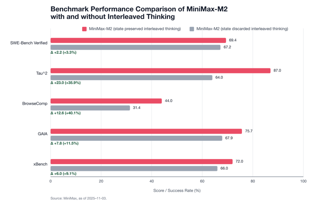 MiniMax M2的发布数据中,有一组数据有力说明了这一机制的效果。