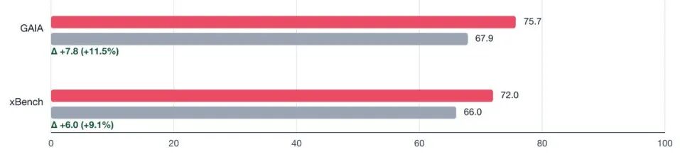 然而,在BrowseComp(网页浏览任务)上,提升幅度达到了惊人的40%(从31.4飙升至44.0);在Tau²这种复杂推理任务上,提升了36%。