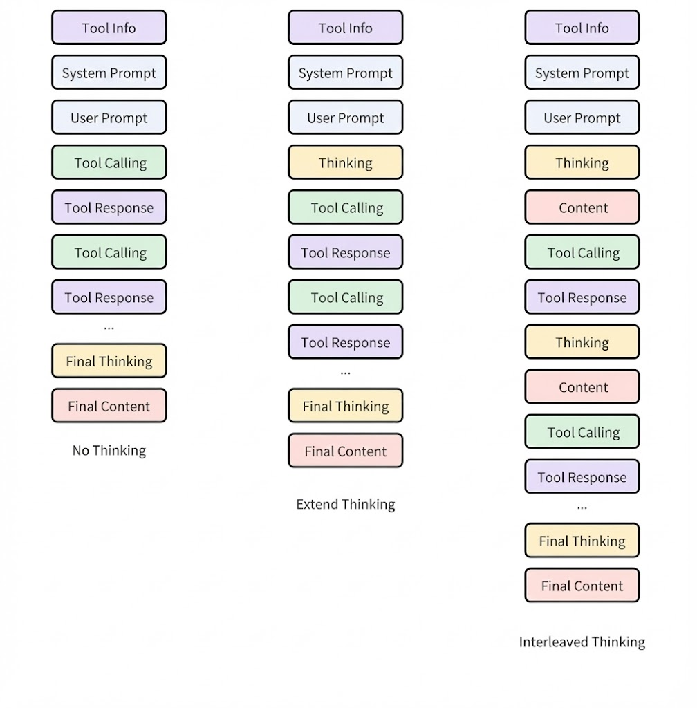 MiniMax等部分厂商也将其称作Interleaved Thinking(交错思维链),从示意图即可看出,二者本质上是等价的。这是一个更贴近技术的称呼。
