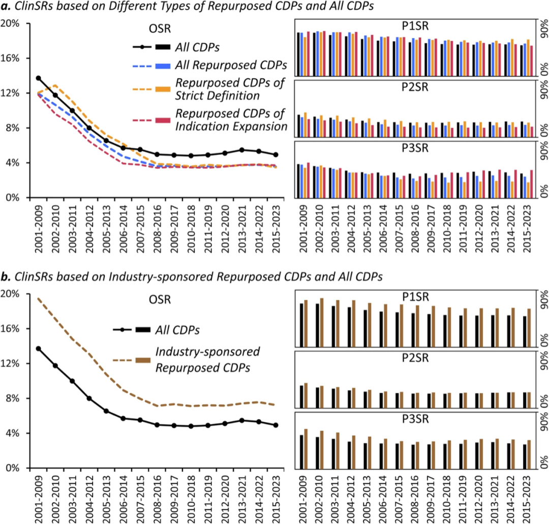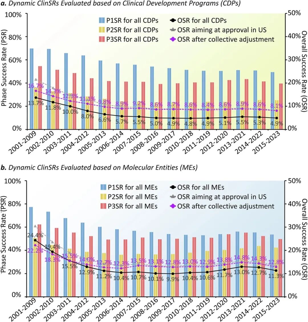 团队建立了严格的数据标准化流程,统一了药物命名体系、临床阶段定义及试验状态分类,确保数据的完整性与一致性。通过敏感性分析确定了9年时间窗口与2年无进展阈值为最优参数,平衡了数据时效性与统计稳定性。基于此,团队构建了用于评估药物在不同临床阶段推进效率(Phase Success Rate, PSR)与整体成功率(Overall Success Rate,OSR)的动态计算框架,系统分析了2000至2023年间9,682个分子实体涉及的20,398个临床开发项目数据,实现了对药物临床成功率的长期动态描绘。这一体系不仅保证了数据的开放性与结果的可重复性,也为未来的实时更新与趋势监测奠定了技术基础。