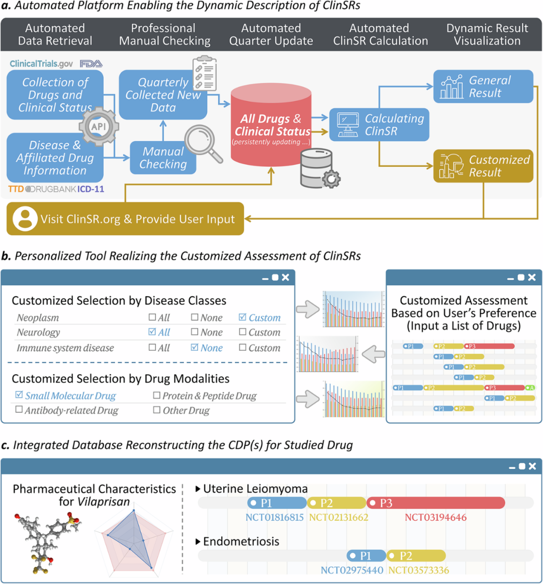 为实现药物临床成功率(ClinSR)的自动化、动态化和个性化评估,该团队构建了开放式在线平台ClinSR.org,集成了自动数据采集、个性化分析和临床开发路径重建三大核心功能。自动化数据更新与动态分析:平台通过对接ClinicalTrials.gov和FDA官网接口,定期自动采集并整合多源临床信息,结合WHO ICD-11、DrugBank和TTD等数据库,实现临床成功率的实时更新与可视化分析。多维度自定义分析功能:公司用户可以自行定义或上传感兴趣的药物列表进行准确的ClinSR计算,实现多维度、个性化分析。临床开发路径系统重建:平台系统重构药物在不同适应症下的临床开发路径,直观呈现其完整研发历程。