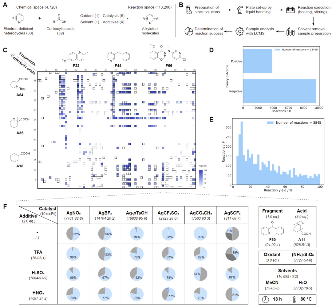 研究人员在 24 孔体系中系统评估羧酸、银盐、酸性添加剂等条件组合,最终执行了 13,490 条反应,覆盖潜在反应空间的约 12%。其中约 30% 获得 ≥5% 产率的正向结果,产率分布均衡,为训练反应预测模型提供了理想数据质量。