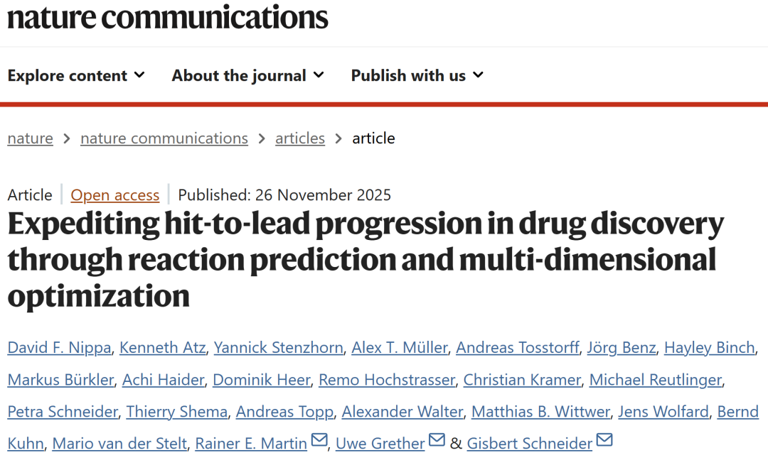 Nippa, D.F., Atz, K., Stenzhorn, Y. et al. Expediting hit-to-lead progression in drug discovery through reaction prediction and multi-dimensional optimization. Nat Commun (2025).