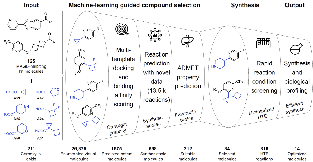 研究人员首先利用 80 个电子缺陷杂环与 59 个 sp³-富集羧酸,在迷你化的 HTE 平台上建立了 13,490 条 Minisci-型反应数据。随后基于这些数据训练图神经网络,用于预测反应产率与二元反应结果。研究人员再将 125 个 MAGL hit 分子与 211 个羧酸片段组合生成 26,375 个虚拟化合物,通过“机器学习筛选漏斗”进行多维度优化,包括模板对接与 2D/3D 评分、反应可合成性预测、关键 ADME 性质预测(LogD、溶解度、P-gp 渗透性、PAMPA)。优先级最高的 34 个分子进入 HTE 条件筛选,最终 14 个成功放大合成并进入生物活性测试与晶体结构研究。
