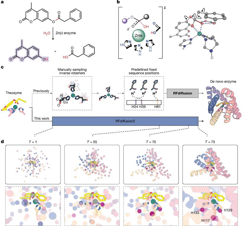 昨日,华盛顿大学David Baker课题组在nature发表了题为“Computational design of metallohydrolases”的文章[1]。文章报道了他们使用最新训练的基于流匹配(flowing match)的新一代生成模型RFdiffusion2对锌离子配位的金属水解酶进行的设计。仅通过对96个设计蛋白的实验,未通过高通量筛选和定向进化,他们就得到了催化效率接近天然金属水解酶的全新金属水解酶。值得一提的是,本文所用到的RFdiffusion2模型也同日见刊于nature methods[2]。