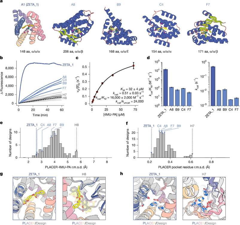 作为RFD2的首次测试,作者选择设计一种能催化荧光底物4-MU-PA(4-甲基伞形酮基苯乙酸酯,图1a)酯键水解的锌金属水解酶。