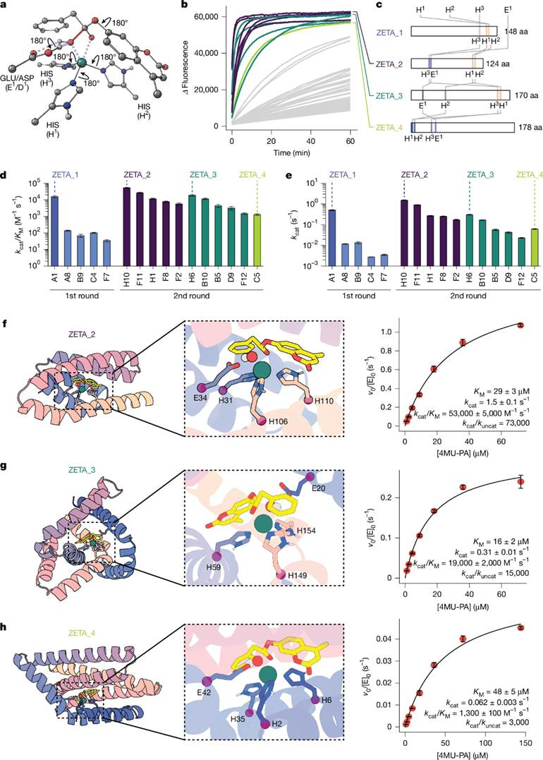 每个骨架最高的活性分别为:ZETA_2:kcat/KM = 53,000 ± 5,000 M⁻¹·s⁻¹,ZETA_3:kcat/KM = 19,000 ± 2,000 M⁻¹·s⁻¹,ZETA_4:kcat/KM = 1,100 ± 200 M⁻¹·s⁻¹。其中,ZETA_2 的 kcat = 1.5 ± 0.1 s⁻¹,是 ZETA_1 的三倍,接近经过十轮定向进化得到的金属水解酶 MID1sc的 kcat 值。