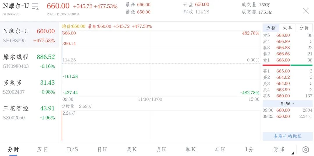 摩尔线程今日敲钟,开盘价约650元,较114.28元的发行价高出469%,开盘市值超3055亿元。