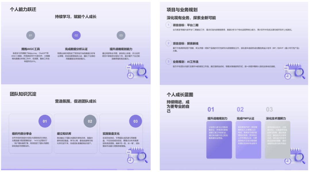 但是我们平时做PPT时花费最长的时间不是把文字粘贴到PPT,而是后续的排版美化步骤,为了更直观看看千问的排版水平,我随机抽了两页出来给大家瞄一眼: