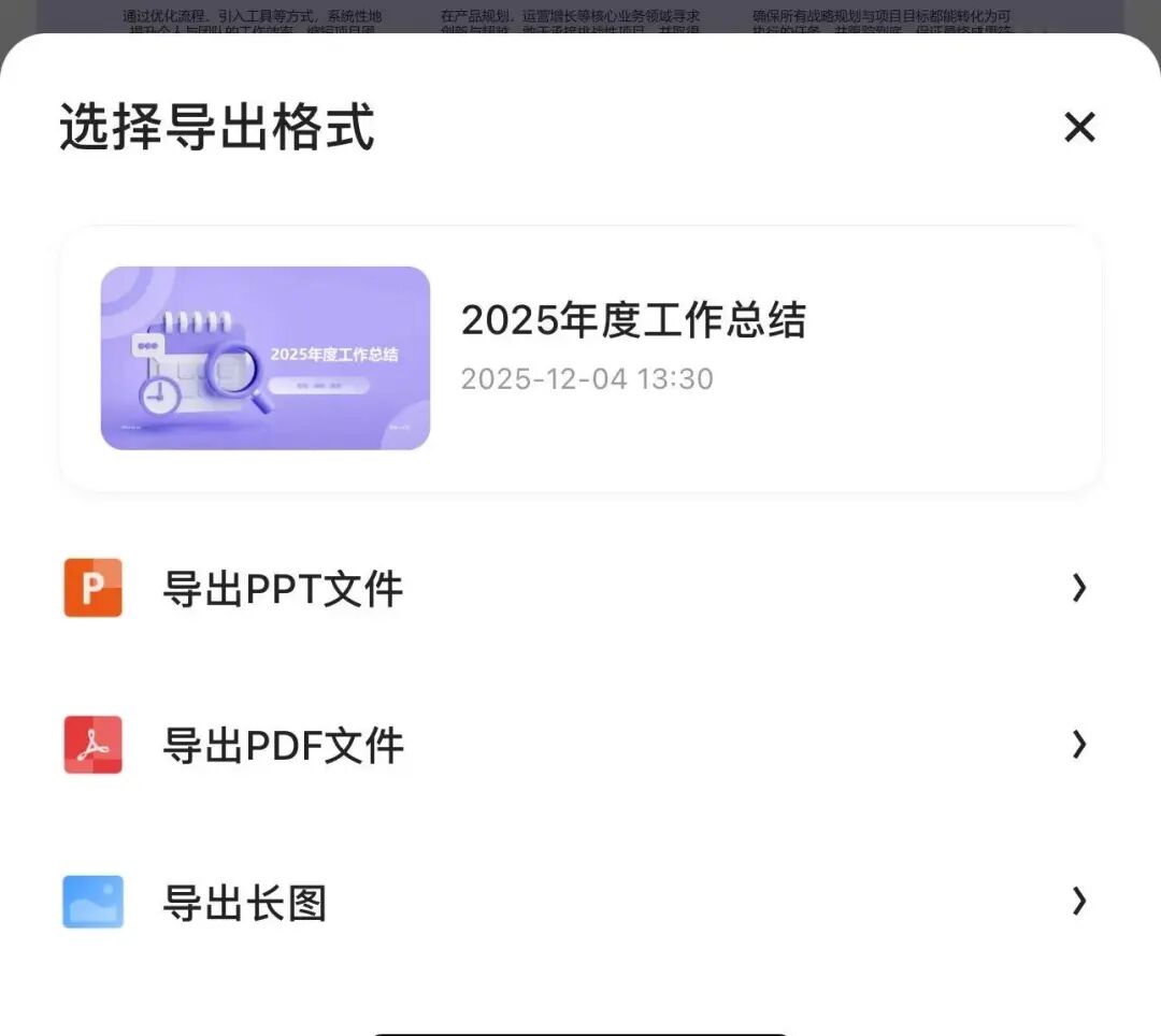 导出方式也很简单,PPT、PDF、长图三种格式随选,不用再去别的工具转格式,手机上一键就完事儿。