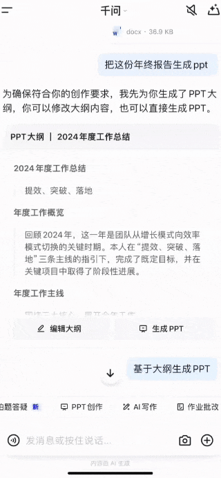 除了生成、编辑、格式调整外,在这次升级中,千问还支持Word/PPT/PDF/Excel等各类格式转换,确保用户相关操作在一个APP里就能完成。